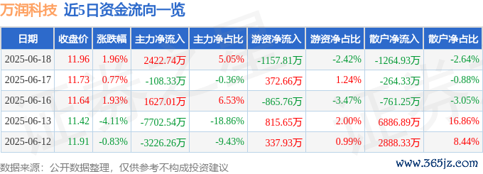 本站消息鑫耀证券,截至2025年6月18日收盘,万润科技(002654)报收于11.96元,上涨1.96%,换手率4.78%,成交量40.42万手,成交额4.79亿元。